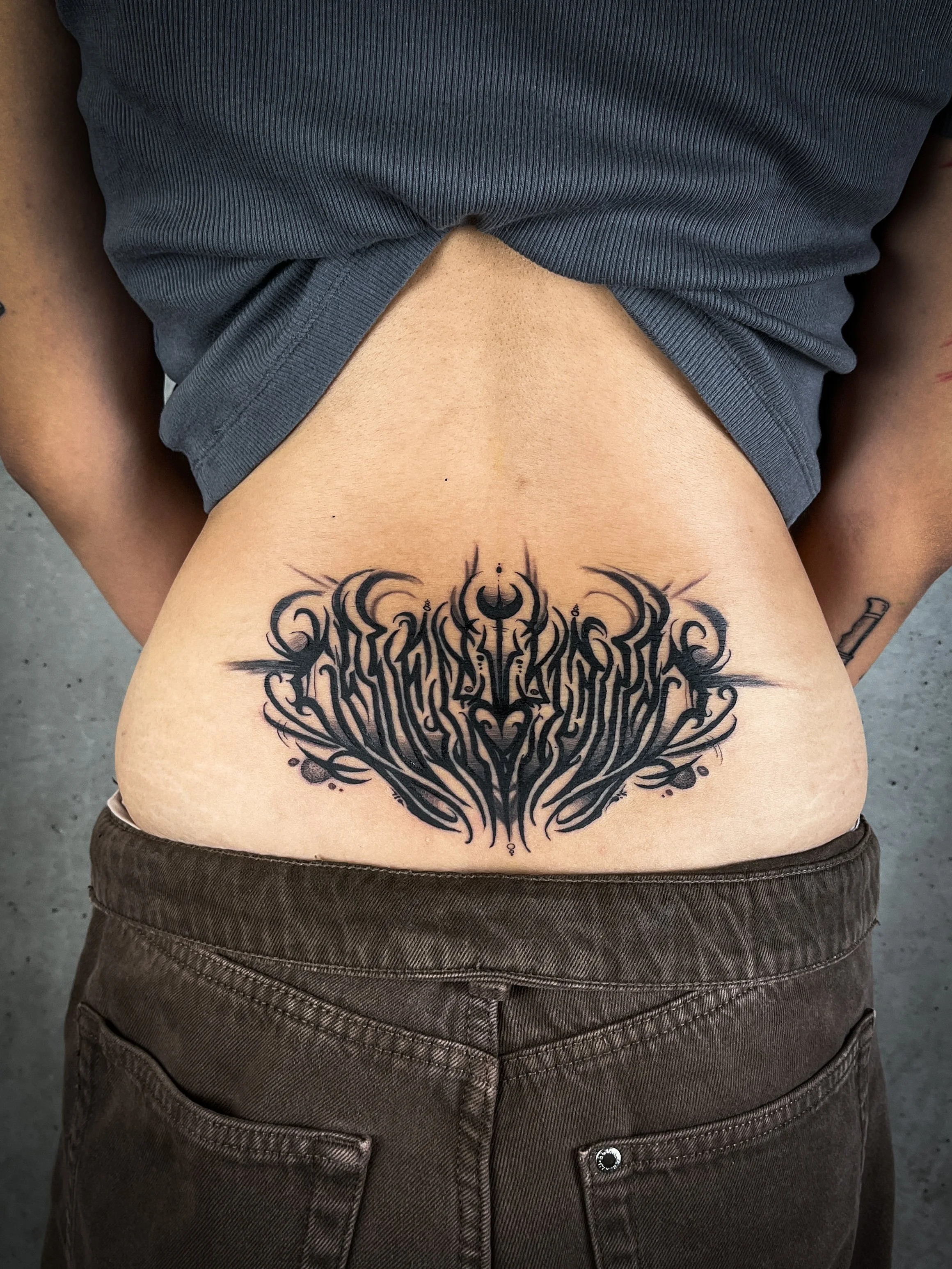 My years of experience in graffiti have shown me the endless possibilities that letters and shapes hold. Every piece of lettering is hand-drawn directly onto the body, tailored to the flow and character of each placement. It’s the freedom that excites me most about tattooing—the opportunity to infuse my own influences and creativity into the artwork, transforming each tattoo into a unique, living piece of art.